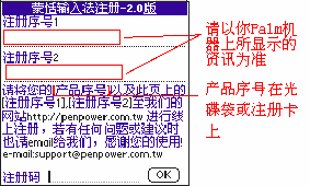 如果你收到两组注册码,表示您购买的蒙恬笔for Palm包含Palm手写板功能,请将第二组Palm手写板的序号填入Palm手写板的注册画面中,完成注册。 |